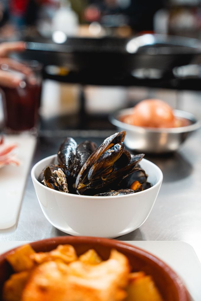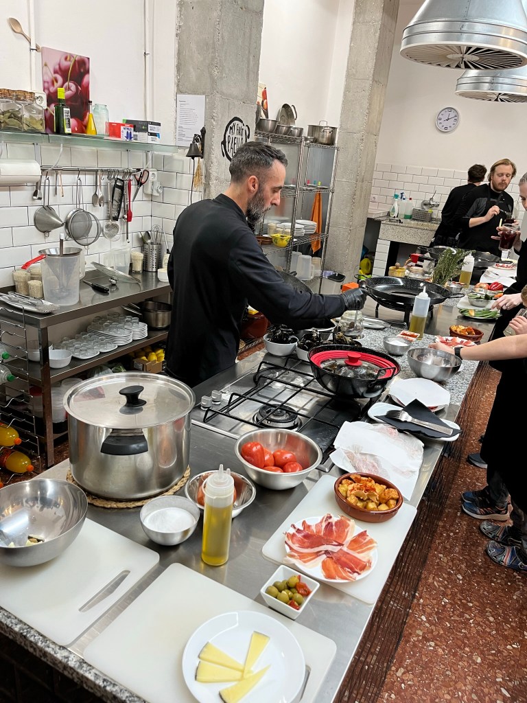 Once we donned our aprons, the party began! Fanta limon was passed around, alongside sangria for the adults. We had some traditional tapas (small plates) that the other chef Jose had prepared for us in advance. Our favorite tapas were the bravas (fried potatoes with a creamy sauce) for Jagger, mussels for Zach, and manchego cheese for Bhakti.