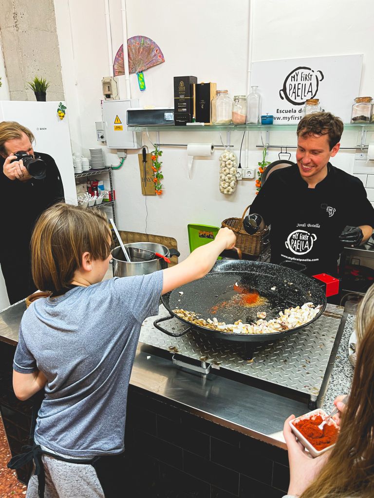 After we left the market, we got to sample some serrano ham (Iberian ham is more expensive and therefore used on special occasions like weddings only) and we began our short walk to the chefs’ kitchen. The first thing Jagger noticed was the sign saying, “My First Paella“. It told us exactly what we were making and that they were not going to mess around!